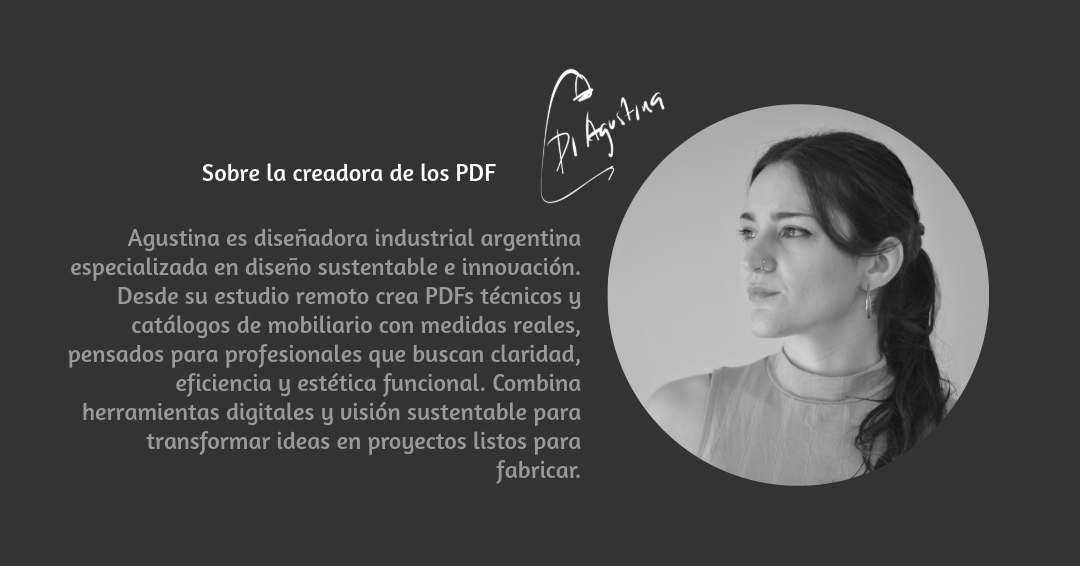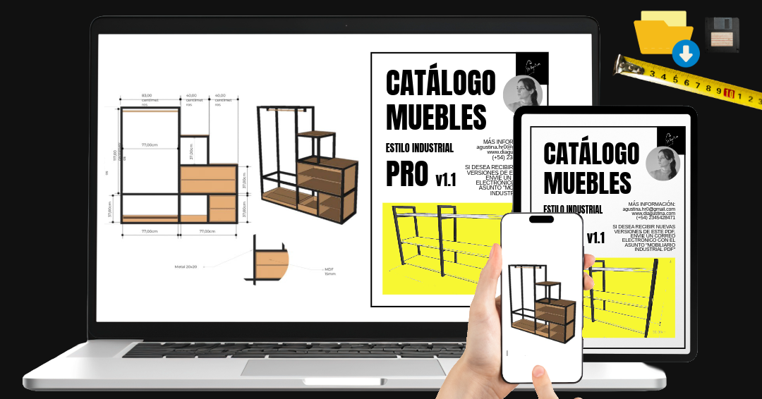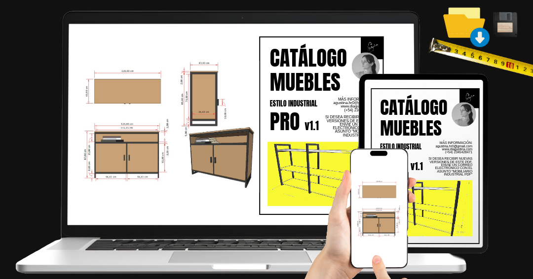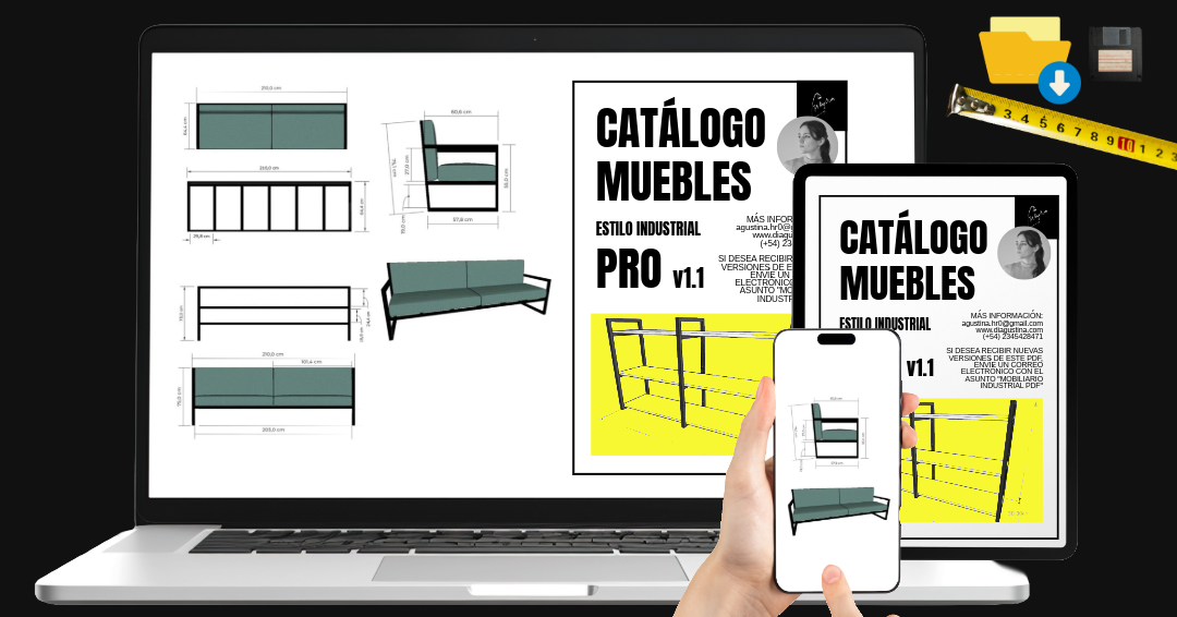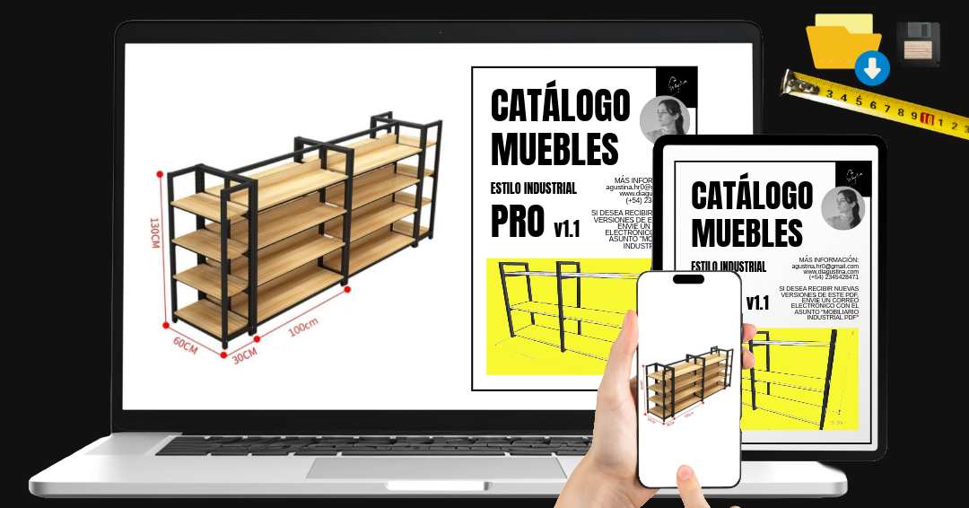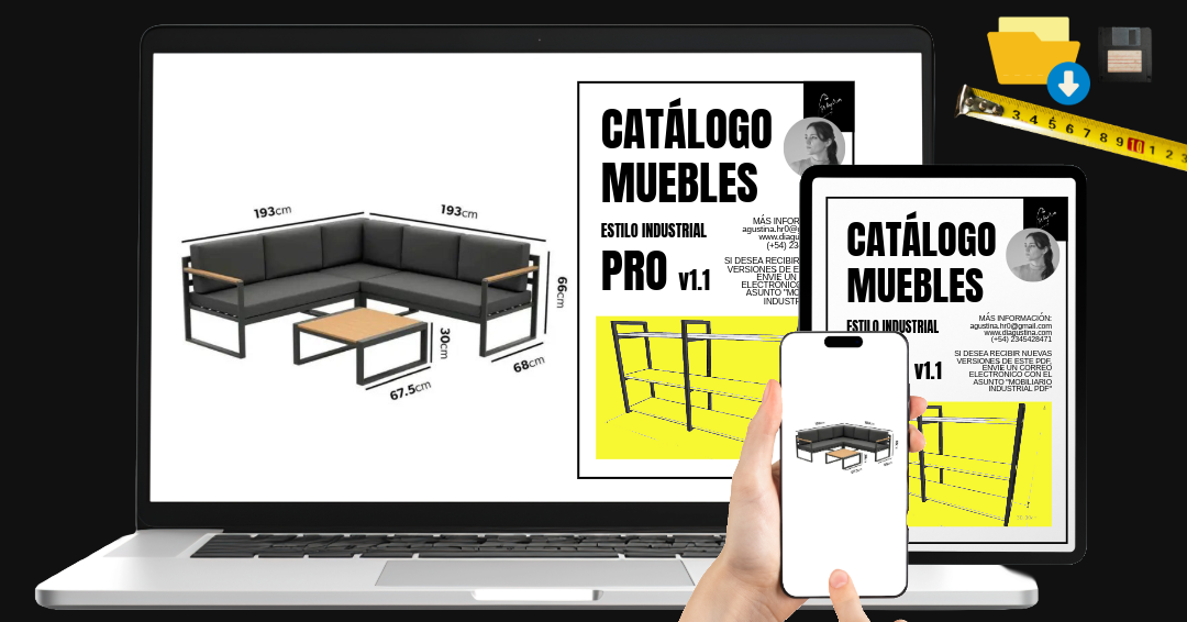 Es un PDF digital exclusivo con muebles de estilo industrial, cada pieza con medidas exactas y organizadas para facilitar el trabajo de profesionales que lideran equipos de producción.